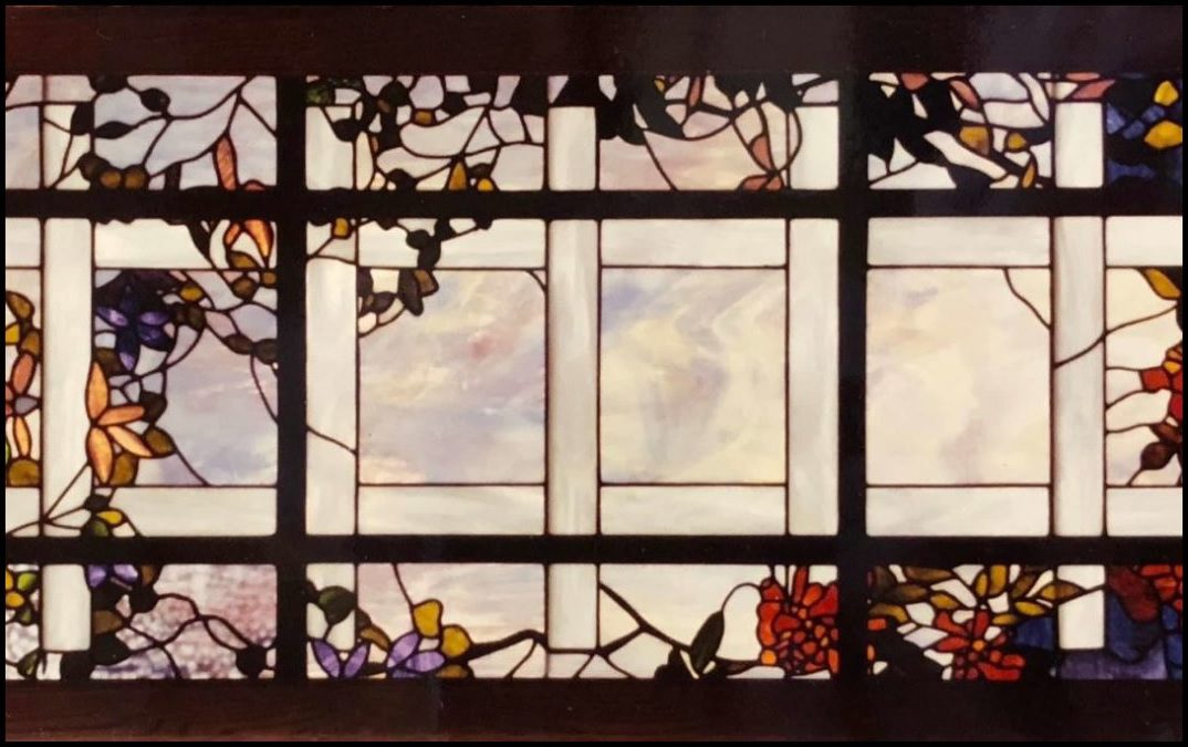 One day, I met Mrs. K, and as usual, I brought along my portfolio of windows and some catalogs of spectacular antiques. Mrs. K asked me to recreate a large panel from a three-window ceiling that had been made by Louis Comfort Tiffany, the Michelangelo of stained glass. I said yes to the most ambitious window I had ever made, and it is pictured above. After that, she wanted me to make another window and then another.