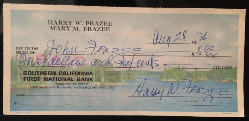 Each year in March, Uncle John would send my dad a birthday card with a check for five dollars. And every August, my dad would send Uncle John a birthday card with a check for five dollars. Dad sent the check above on August 28, 1974, two days before Uncle John’s birthday, so that it would make it from Tarzana to La Canada exactly on time.